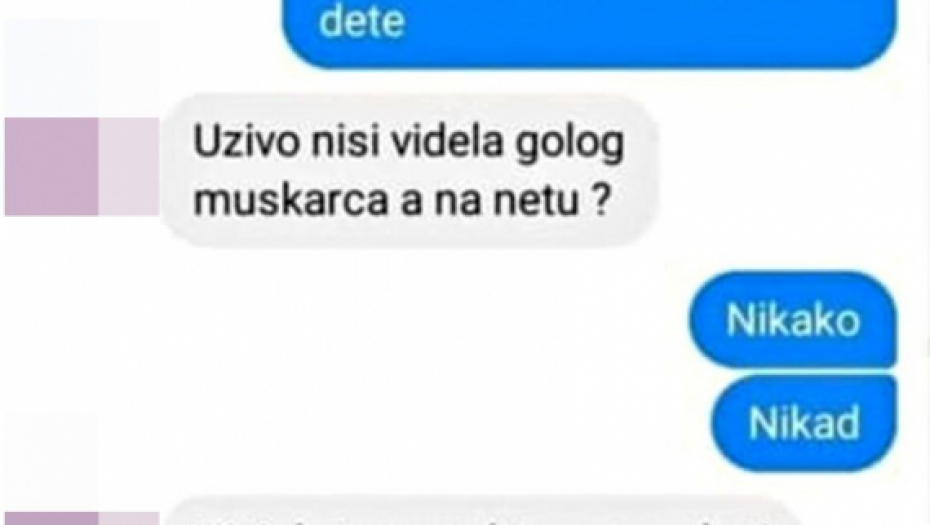 - Uživo nisi videla golog muškarca na netu? Nisi, dete, srce. Deca su mala. Ti si velika i se*si izgledaš. Ne znam samo kakve si*e imaš. Daj sliku u majici ili brusu, molim te - zahteva on.