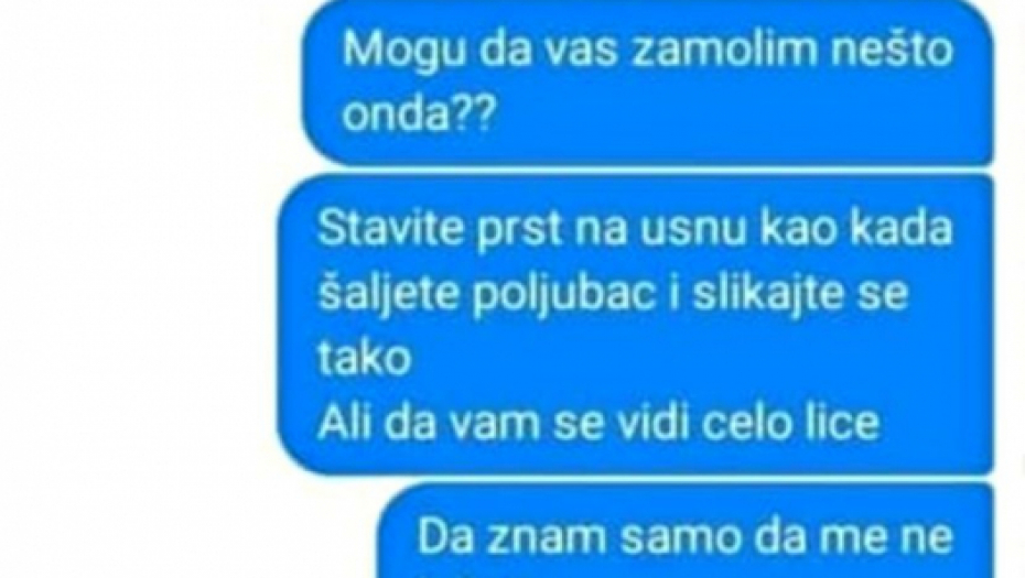 - Mogu da Vas zamolim nešto onda? Stavite prst na usnu kao kada šaljete poljubac i slikajte se tako, ali da vam se vidi celo lice. Da znam samo da me ne lažete.