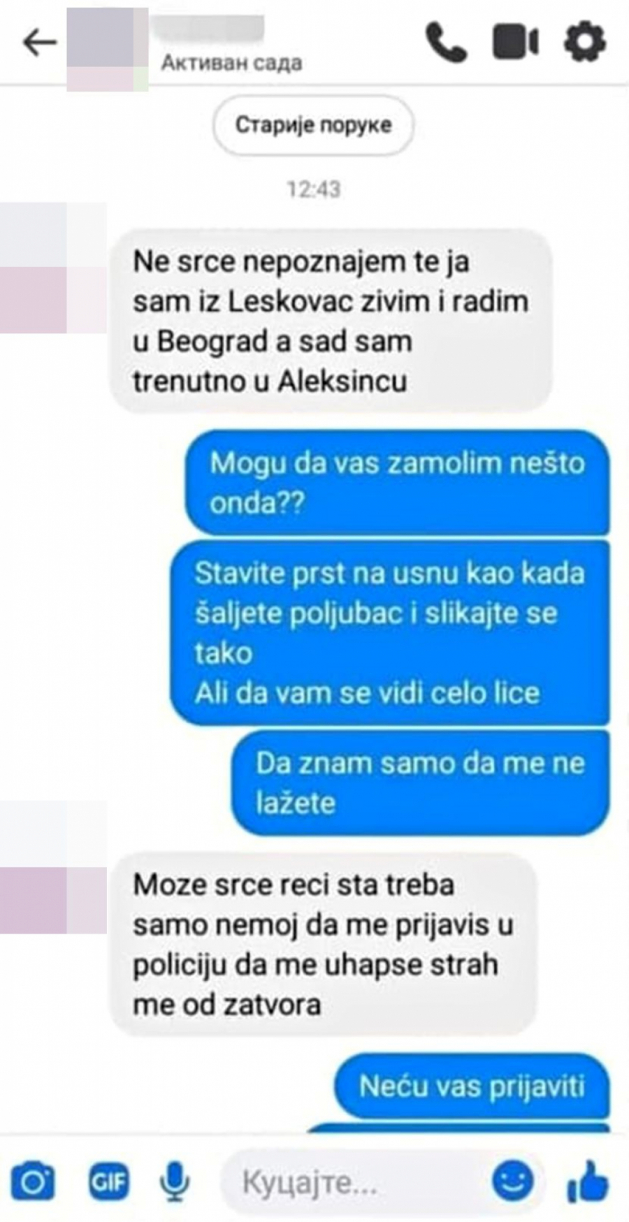 U nastavku dopisivanja objašnjava i da je iz Leskovca, da radi u Beogradu, ali da je trenutno u Aleksincu. Ujedno, moli da ne bude prijavljen policiji, strah ga je od zatvora.