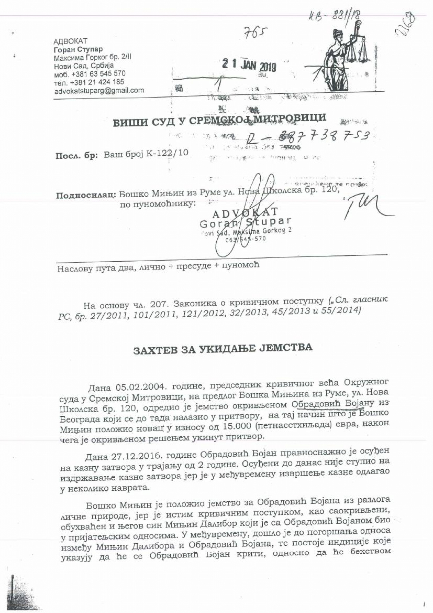 Penzioner navodi da se 22. aprila 2021. obratio Posebnom odeljenju za suzbijanje korupcije Višeg javnog tužilaštva u Beogradu i da je podneo krivične prijave protiv predsednika Trećeg osnovnog suda Dušana Agatonovića, Odeljenja za izvršenje krivičnih sankcija ovog suda i Bojana Obradovića, kao i da je o svemu obavestio Ministarstvo pravosuđa Srbije, ali da ništa nije preduzeto.