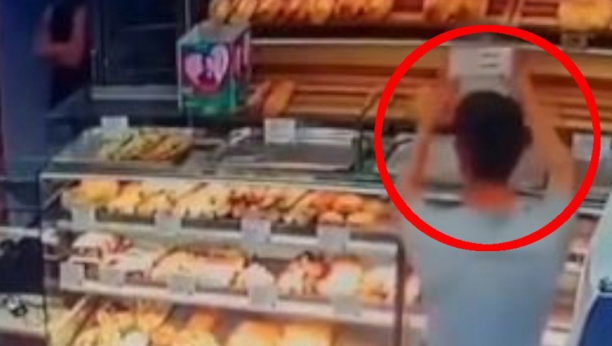 Na snimku objavljenom na Instagram stranici 192_rs vidi se da jedan muškarac stoji kod vitirine s pecivima, a potom u pekaru uleće drugi u sivoj majici, uzima kutiju i istrčava.
