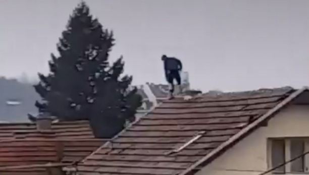 Mladić se ponaša uznemireno, naizmenično sedi na ivici krova, pa povremeno ustaje i neartikulisano maše rukama.
