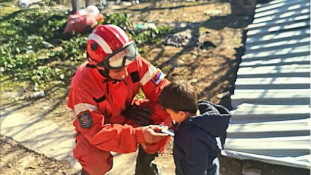 Da mali gest znači mnogo, dokazuje i fotografija srpskog spasioca koji sa dečakom deli čokoladu.