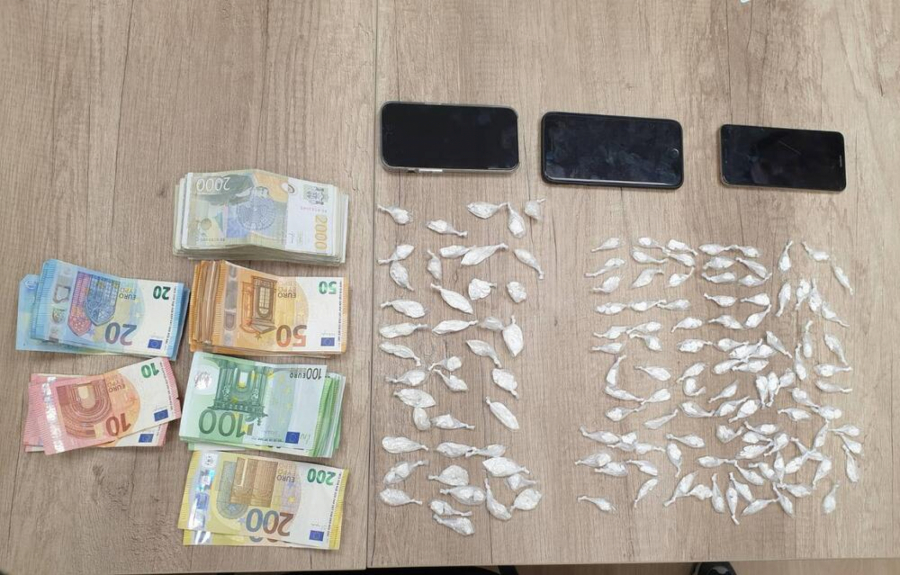 Prilikom pretresa kuće osumnjičenog u Inđiji policija je ispod stepeništa, u patikama, pronašla 141 paketić sa ukupno 100 grama praškaste materije za koju se sumnja da je kokain, 4.250 evra i 294.000 dinara, za koje se sumnja da potiču od prodaje opojne droge.