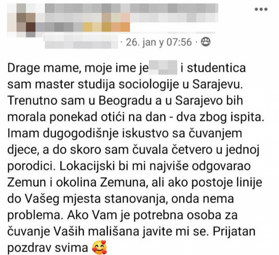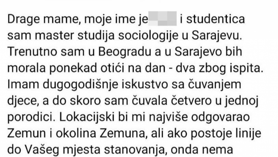 Lokacijski bi mi najviše odgovarao Zemun i okolina Zemuna, ali ako postoje linije do Vašeg mjesta stanovanja, onda nema problema. Ako Vam je potrebna osoba za čuvanje Vaših mališana javite mi se. Prijatan pozdrav svim'', napisala je.
