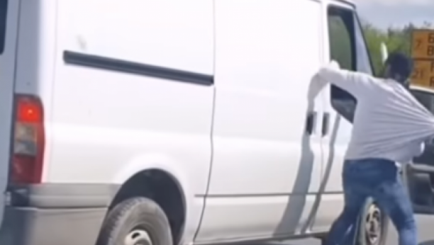 Kako se vidi na snimku, muškarac obučen u belu majicu nasrnuo je na vozača belog kombija te ga je kroz prozor gađao nepoznatim predmetom.