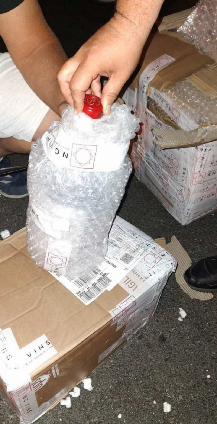 Međutim, pored prijavljenog upotrebljavanog nameštaja, u tovarnom delu kombija se našlo i 18 kartonskih kutija ispunjenih raznim francuskim i italijanskim vinima. Кako se radi o specifičnoj akciznoj robi, njena tačna vrednost će tek biti komisijski utvrđena, ali se svakako radi o vinima poznatih robnih marki (Chateau La Fleur, Corton Grand Cru, Biserno, Vega Sicilia i dr.), čije se tržišne cene kreću u rasponu od 100 do 3000 evra po boci.