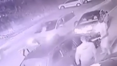 Kako se vidi na snimku sa nadzorne kamere, sve je počelo kada je jedan automobil presekao put drugom kako bi ga zaustavio. Tada su iz prvog vozila izašla trojica muškaraca sa palicama u rukama i krenula ka drugom autu.