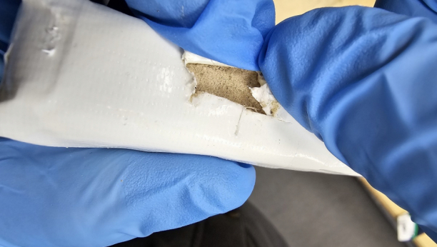 Međutim, tokom detaljnog pregleda vozila, u toaletu iznad umivaonika, u posudi za tečni sapun, pronađeno je pet presovanih paketa žućkaste materije, nalik opojnoj drogi heroin.