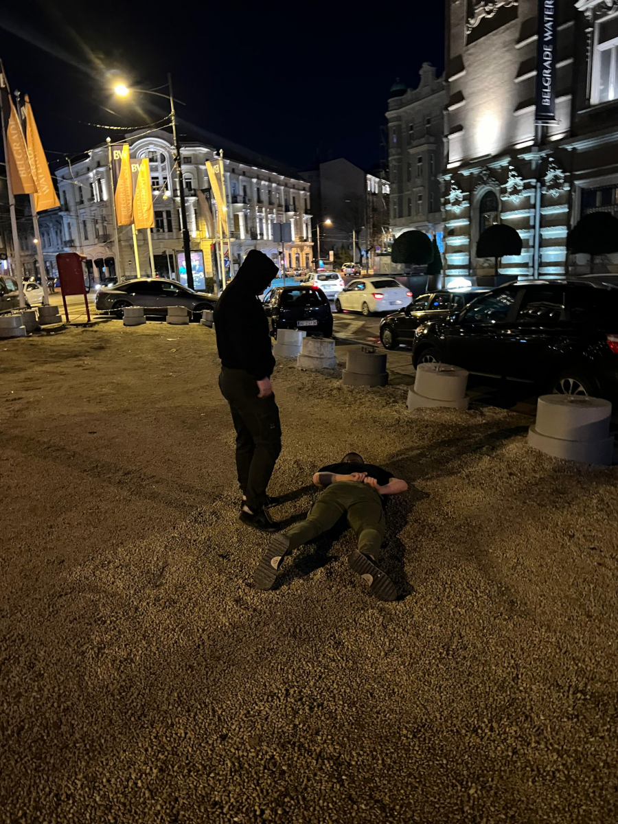 Inspektor je prišao muškarcu, naredio mu da spusti mačete na zemlju i legne sa rukama na leđima. Utvrđeno je da se radi o Goranu B.(21) , koji je rekao da je bio u klubu sa devojkom i da ga je neki momak stalno gledao. Izašao je iz kluba i otišao do svog automobila. Verovao je da će ga napasti više osoba, pa je iz gepeka izvadio mačete.