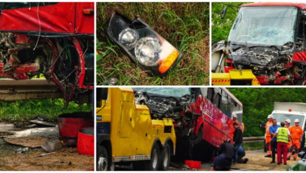 Prednji deo autobusa, kao i putničkog vozila potpuno su smrskani, a delovi su rasuti svuda po putu. Srča je na sve strane.