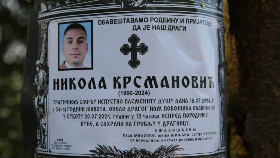 -Obaveštavamo rodibinu i prijatelje da je naš dragi Nikola Krsmanović tragičnom smrću ispustio plemenitu dušu dana 18. jula 2024. godine u 34-oj godini života. Opelo dragog nam pokojnika obaviće se 20. jula 2024. u 13 časova ispred porodične kuće, a sahrana na groblju u Dragincu - piše na čitulji koju potpisuju njegovi najmiliji.