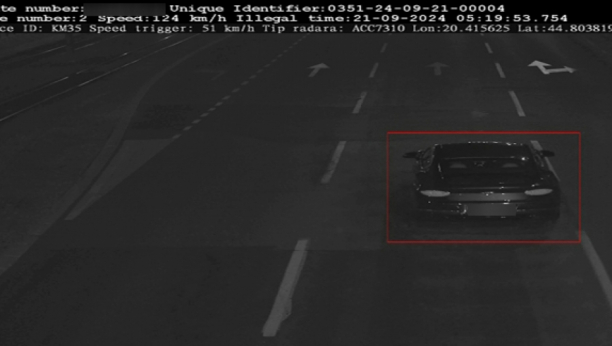 Pripadnici saobraćajne policije Ministarstva unutrašnjih poslova, primenom sistema za automatsku detekciju prekršaja prekoračenja brzine, utvrdili su da se jutros u 05.19 časova, u ulici Jurija Gagarina u Beogradu, vozilo "bentli" kretalo brzinom od 124 kilometra na čas, na delu puta u naselju gde je ograničenje brzine 50 kilometara na čas.