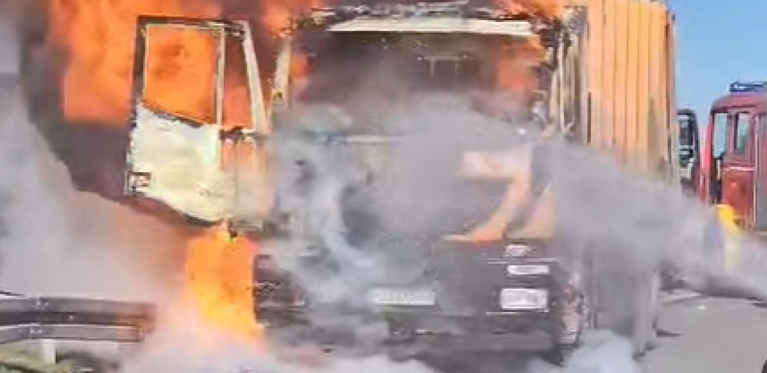 Požar na kamionu Javnog kumunalnog preduzeća Čistoća. Na licu mesta dva vatrogasna vozila.