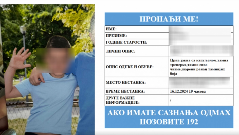 -Po prijavi nestanka dečaka, pripadnici Ministarstva unutrašnjih poslova aktivirali su sistem Pronađi me za hitno obaveštavanje nakon nastave, jer se nije vratio kući iz škole "Branko Radičević" na Novom Beogradu, navodilo se u saopštenju MUP-a.