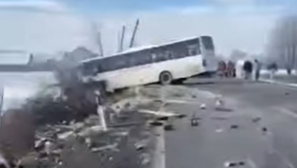 Kako se vidi na snimku koji je objavljen, autobus je sleteo sa puta, kamion je u potpunosti uništen i delovi vozila su rasuti po putu.