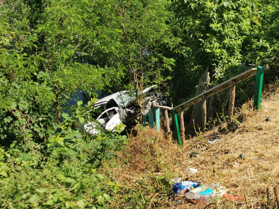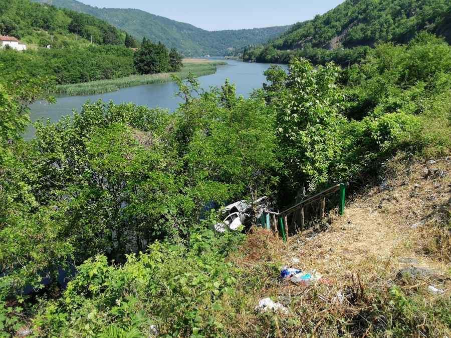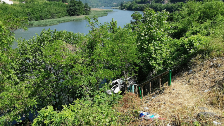 Pikap vozilo od siline udara prešlo je preko bankine i sletelo na obalu jezera, zaustavivši se na samoj ivici.
