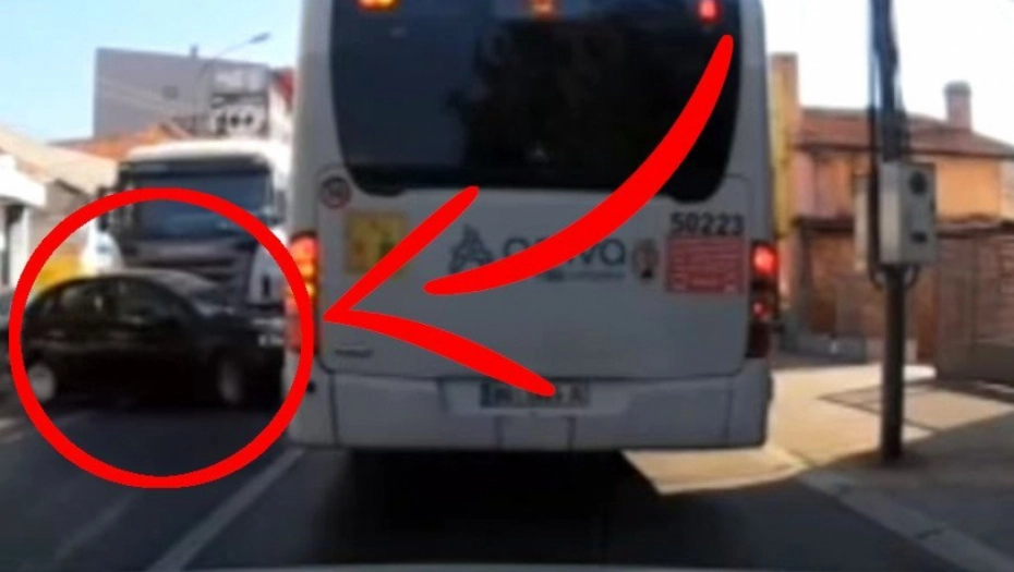 Na video materijalu, koji je objavio iKragujevac, vidi se automobil koji pokušava da skrene između autobusa i kamiona, nakon čega ga je šleper izgurao.