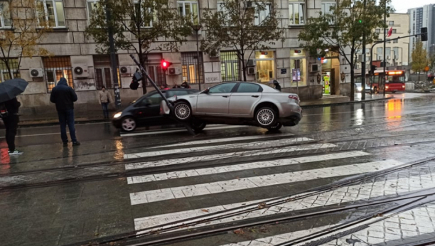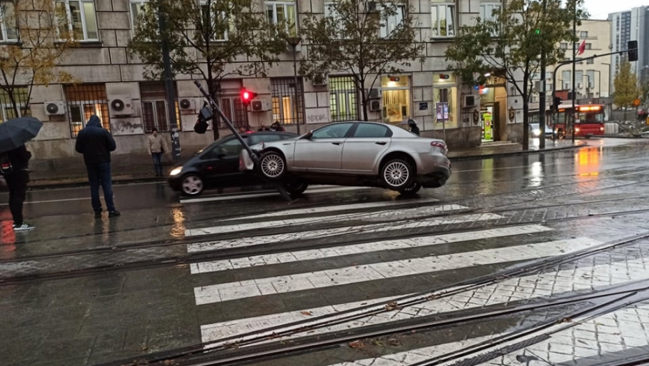 Vozilo marke "alfa romeo" je ulazeći u Nemanjinu ulicu udarilo u semafor na koji se automobil bukvalno okačio.