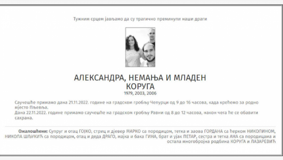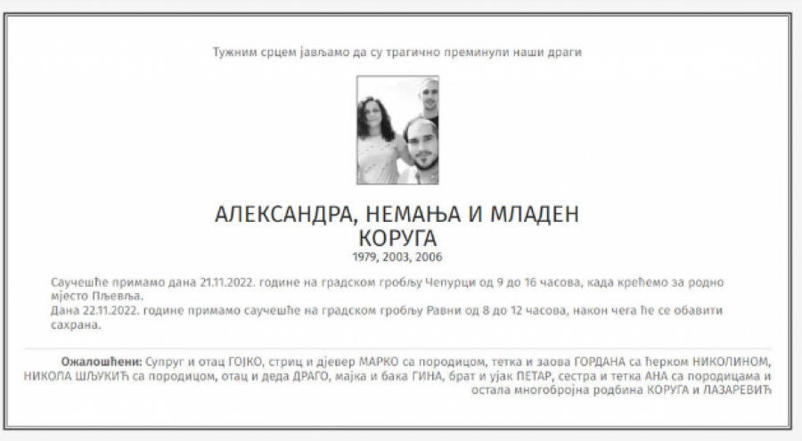 Kako stoji na umrlici, Aleksandra, Nemanja i Mladen biće sahranjeni 22.11.2022. u Pljevljima na gradskom groblju Čepurci.