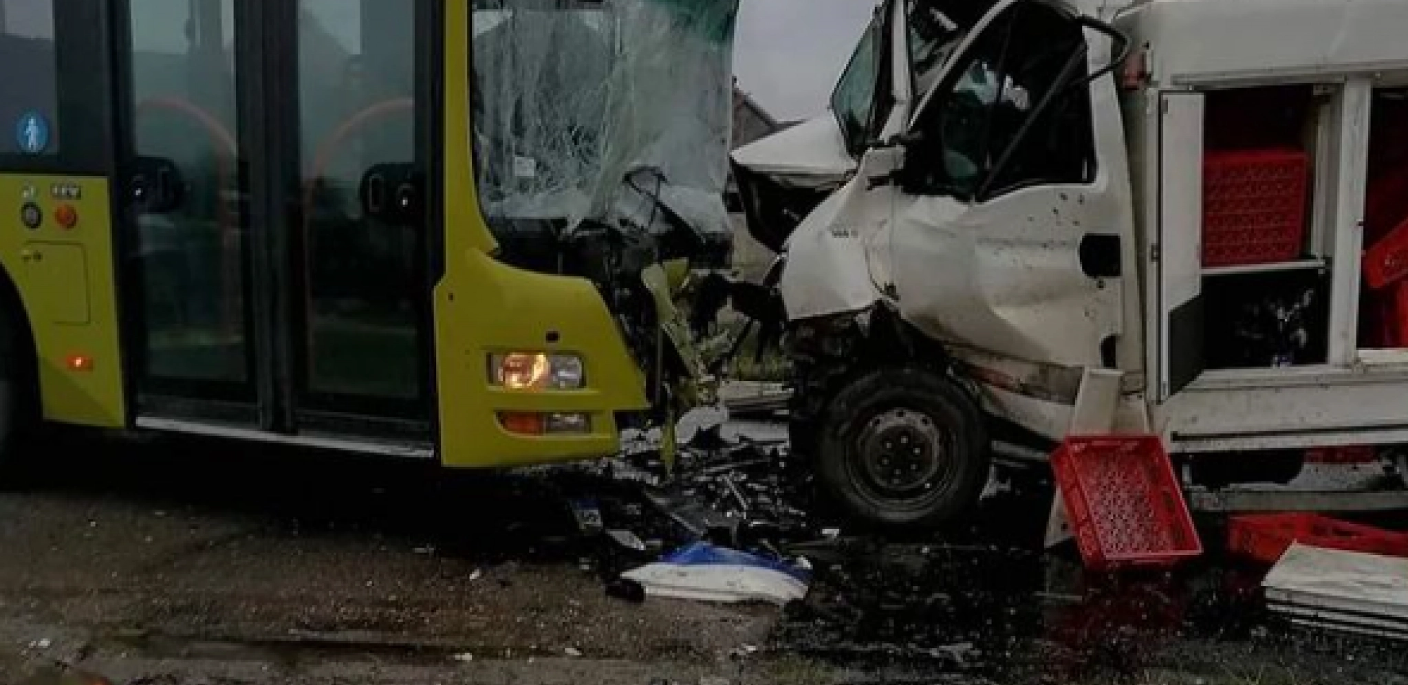Kako se može videti na fotografiji, prednje strane i kamiona i autobusa su potpuno uništene, a delovi vozila rasuti su po putu.