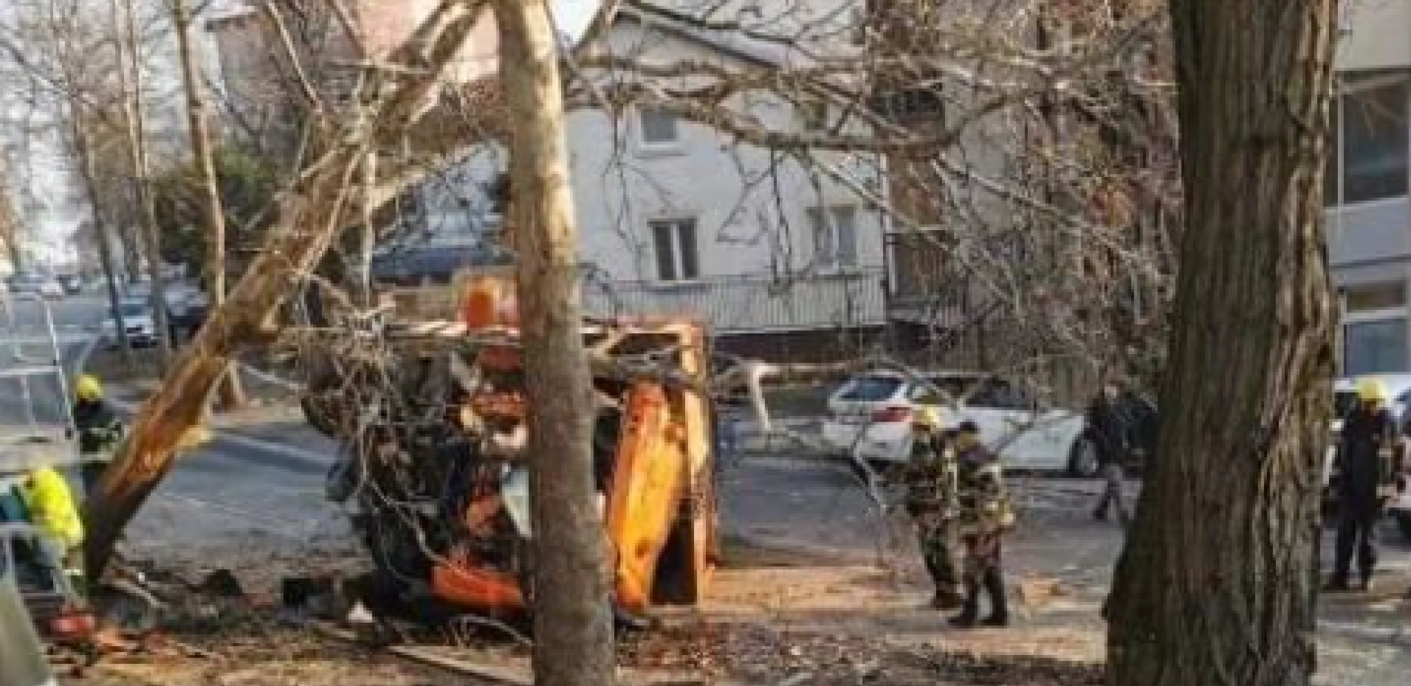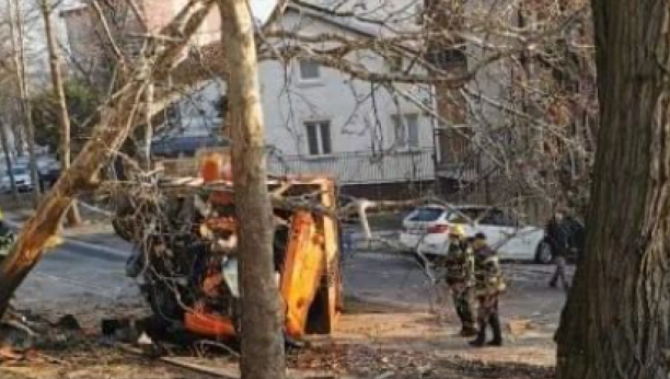 Transportno vozilo za kontejnere prevrnulo se nakon što je udarilo u drvo pored puta.
