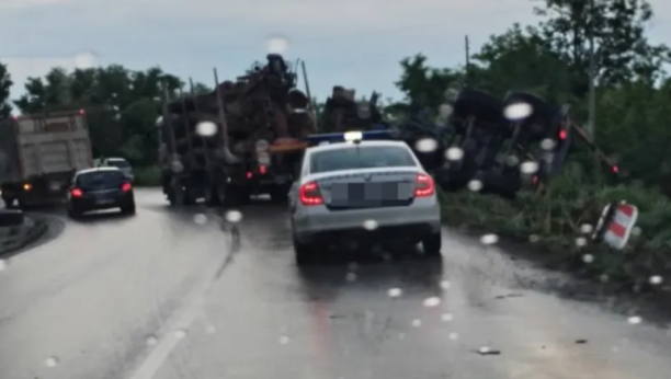 KARAMBOL KOD ARANĐELOVCA Prevrnula se kamionska prikolica puna balvana (FOTO)