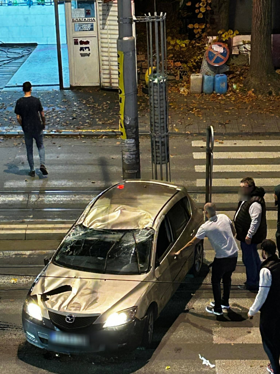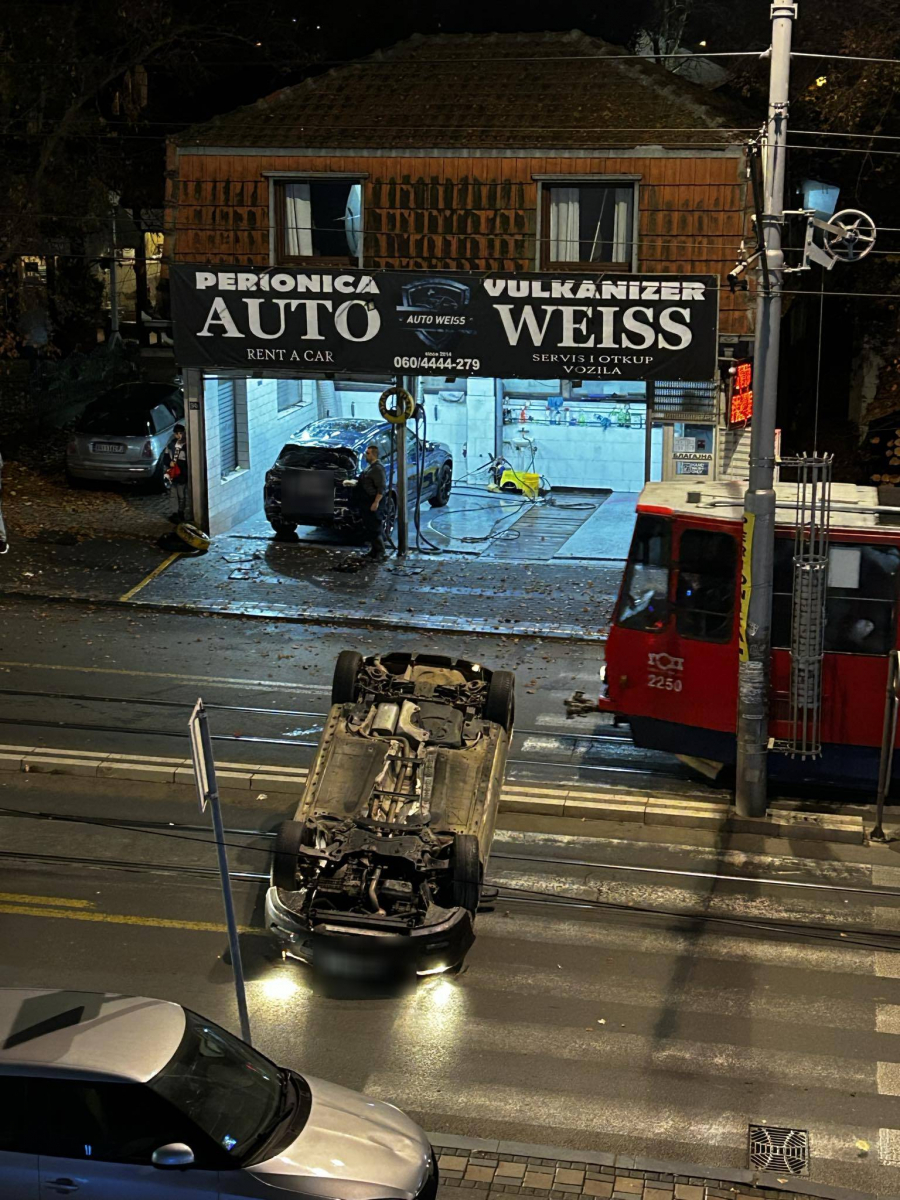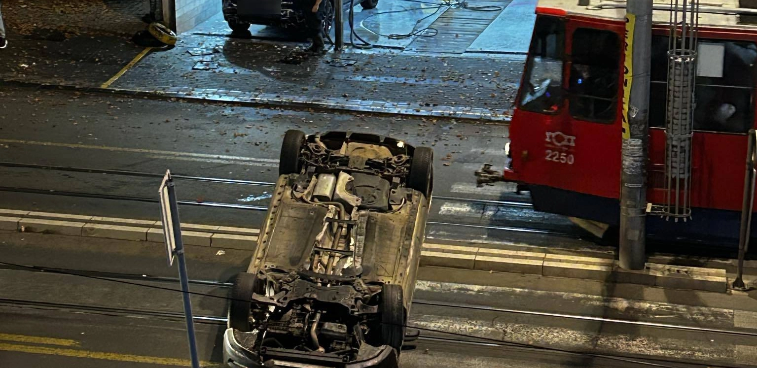 Iz za sada neutvrđenih razloga, putničko vozilo je završilo na krovu, preprečivši tramvajske šine.