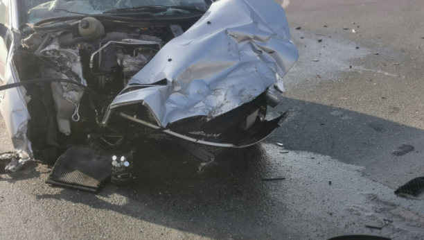 Putničko vozilo potpuno je smrskano sa prednje strane.