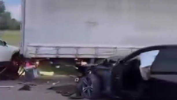 Automobil marke BMW zakucao se u kamion, pretrpevši ogromnu materijalnu štetu, dok je drugo putničko vozilo ostalo "zaglavljeno" između bandere i prikolice kamiona.