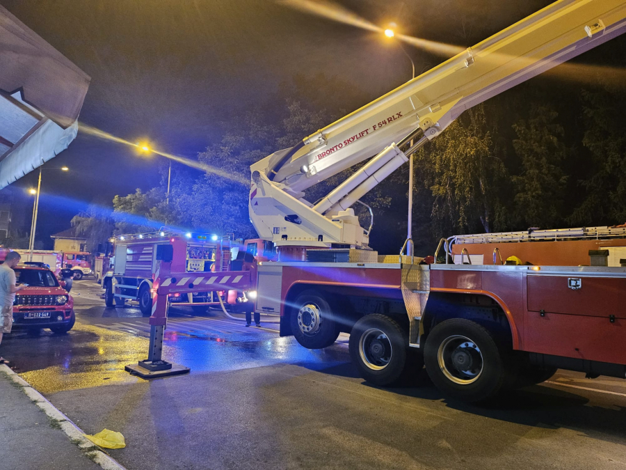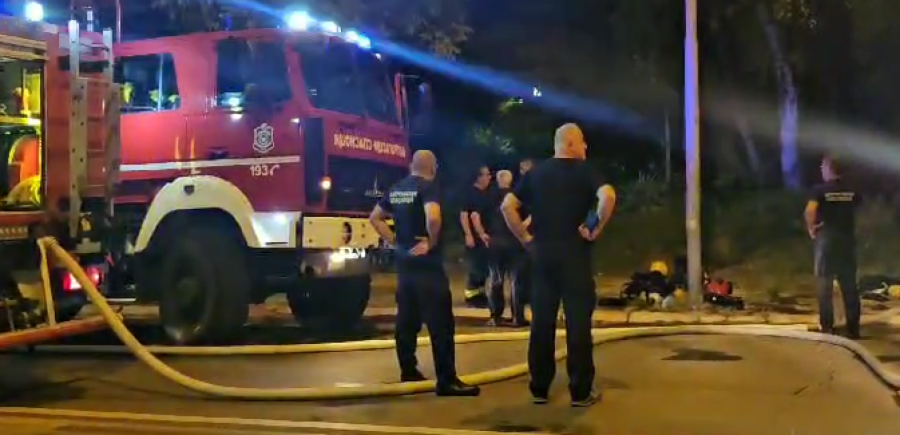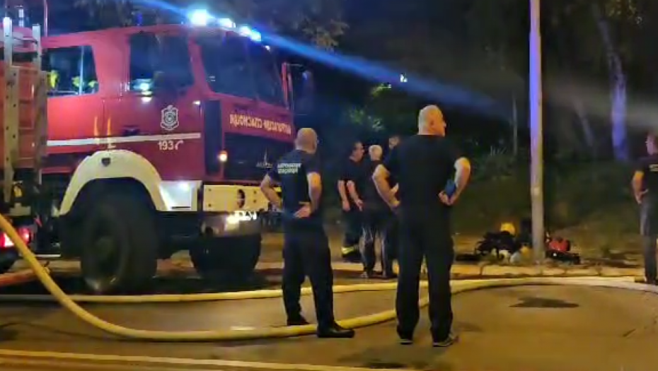 Na terenu se nalazi sedan vatrogasnih vozila i policija.