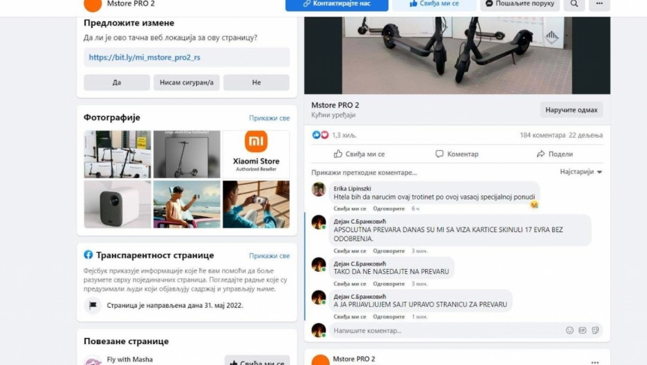 Kad je na Fejsbuk stranici M Store PRO2 video ponudu: „Xiaomi prodaje stari model Mi Pro 2 električni trotinet po specijalnoj ceni od samo 235 RSD“ Dejan Branković (47) iz Beograda nije časio ni časa - naručio je jedan. Da je reč o prevari, shvatio je kad su mu sa kartice skinuli 17 evra, a robu mu nikad nisu isporučili.