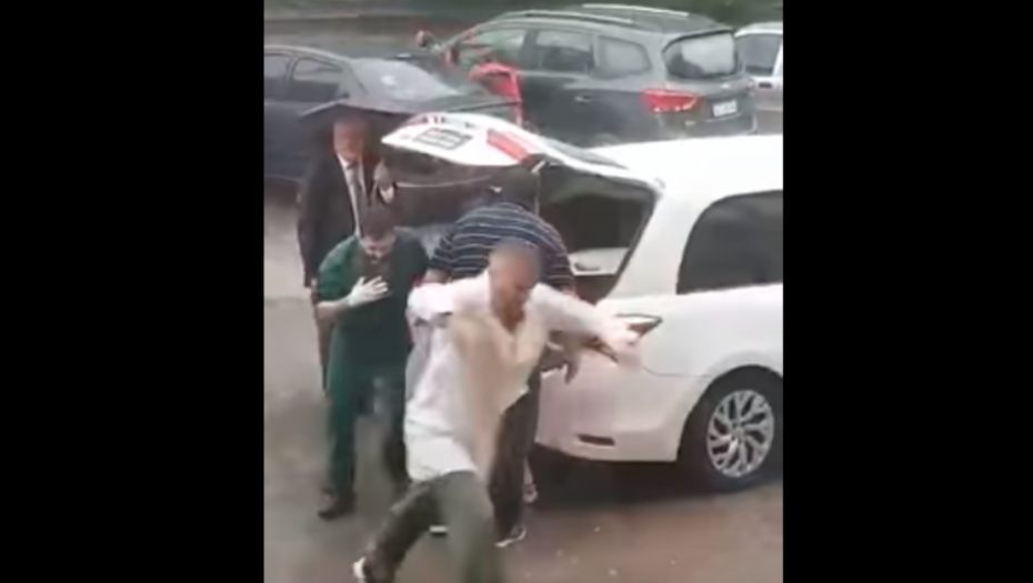Video snimljen na licu mesta pokazuje kako lekar i osoblje bolnice uz članove porodice stoje uz pogrebno vozilo da ispitaju telo u kovčegu.