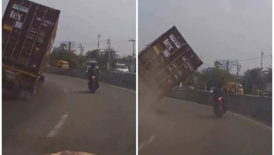 Trenutak je snimljen iz vozila iza njega, a sve se dogodilo 21 marta. Na snimku se vidi kako motociklista obilazi kamion sa velikom prikolicom, ali na vreme je uočio kako je vozač kamiona izgubio kontrolu nad vozilom i da se prikolica počela da naginje.