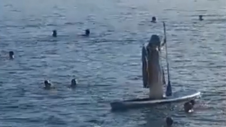 Kupače riječke plaže Morski prasac iznenadila je pojava "Gospe" u plićaku. Devojka obučena u devicu Mariju veslala je na dasci za surfovanje nedaleko od ljudi koji su se kupali i izazvala različite rakcije.