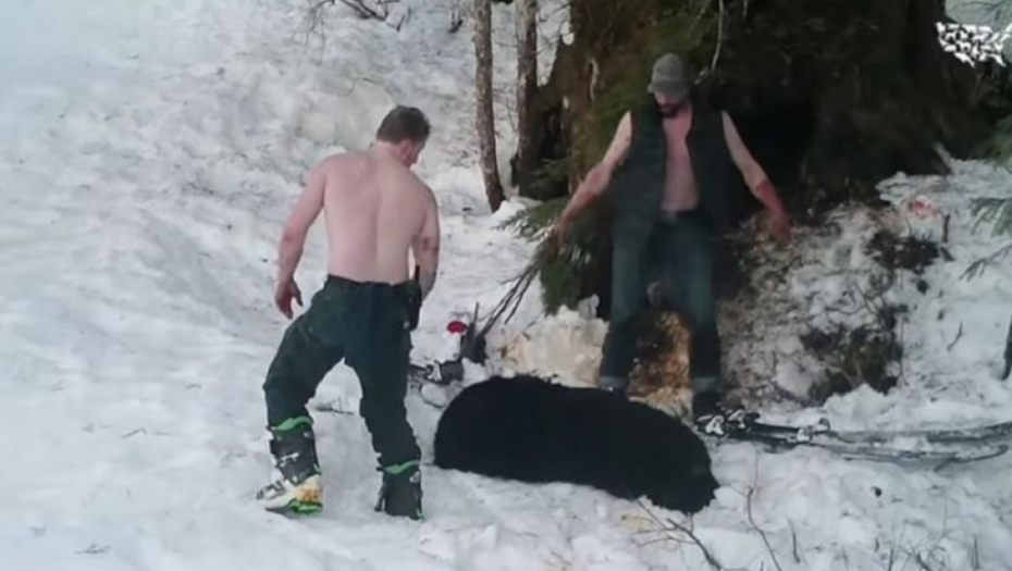 Nakon što su izvukli mrtvu medvedicu dvojica svirepih ubica proslavili su svoj "uspeh" pljeskanjem.
