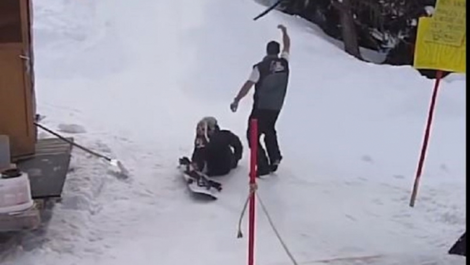 Nabeđeni snouborder pokušava da „uhvati“ ski-lift „sidraš“, ali čak i uz asistenciju – pada na nos, i to tri puta. Najzad pada i sam asistent…