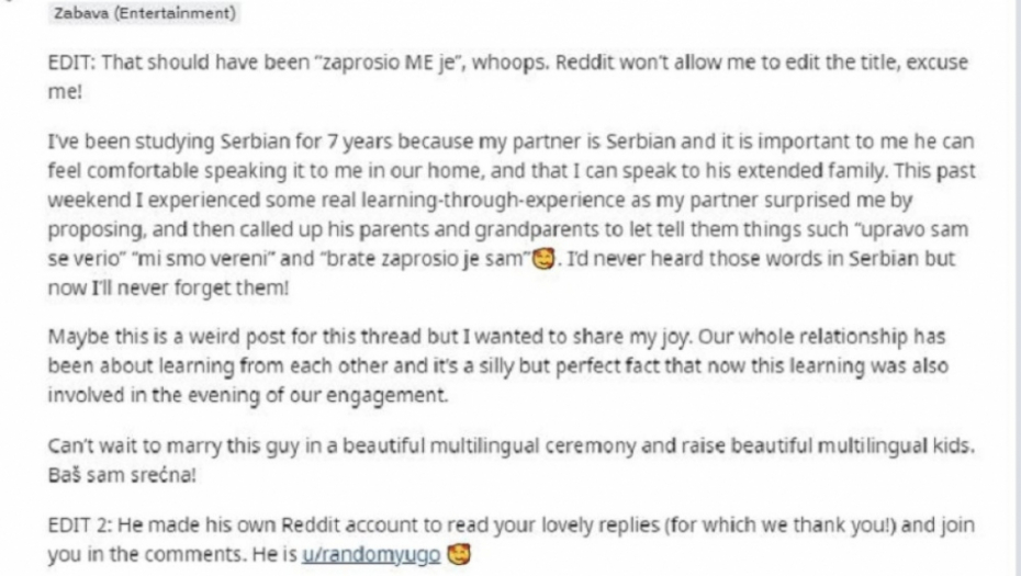 "Dušan (24) i ja smo sedam godina u vezi. On je iz Beograda, ja sam iz Holandije gde i živimo zajedno. Ponosna sam na to da trenutno dobro razumem srpski, ali kao što sam napisala u postu, nikad nisam čula reč ’veriti‘ i ’zaprositi‘ do prošle nedelje kad me je Dušan zaprosio na holandskom i onda pozvao svoje roditelje i rekao ’Upravo sam se verio‘", ispričala je Holanđanka Megan, prenosi portal DDL.