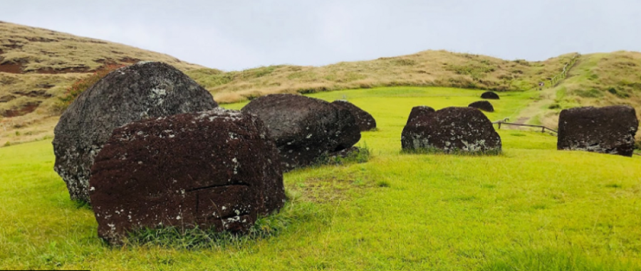 Mađutim, najčudije je bilo ono što je video na ostrvu. Duž cele obale našao je velike kamene glave dugog lica i izuzetno velikih i dugih ušiju. Neke su imale ruke a druče šešire načinjene od crvene lave. Uskoro je otkrio da se ovi kipovi ne pojavljuju samo duž obale, već da ih ima po celom ostrvu. Mnogi su pronađeni, još nedovršeni, u kamenolomima u kojima su klesani. Većina skulptura je visine do 3,5 metara ali ih ima i 12 metara.