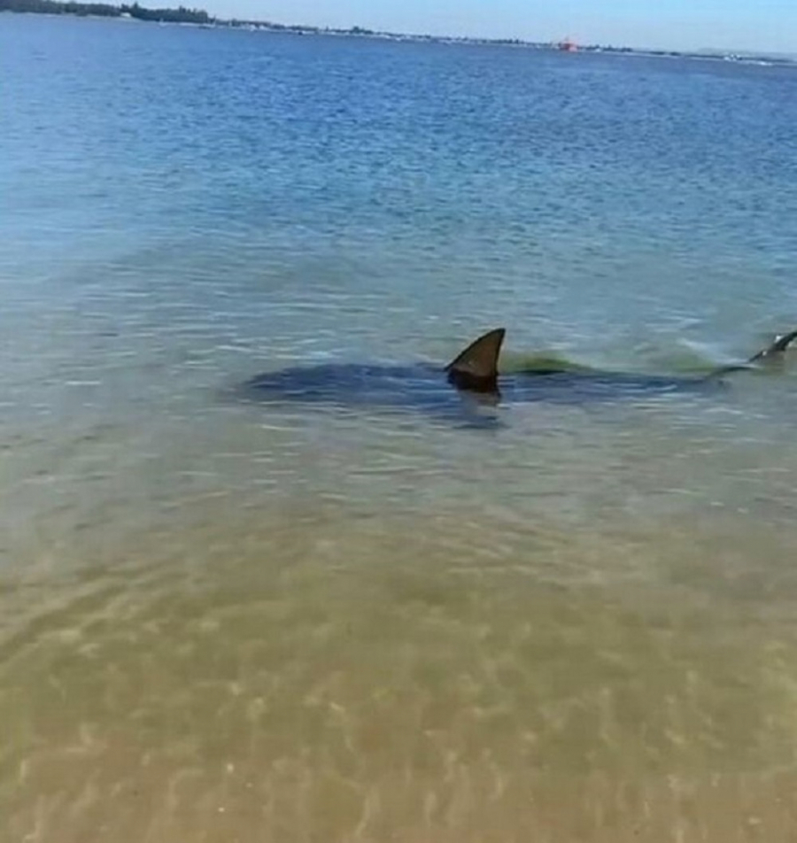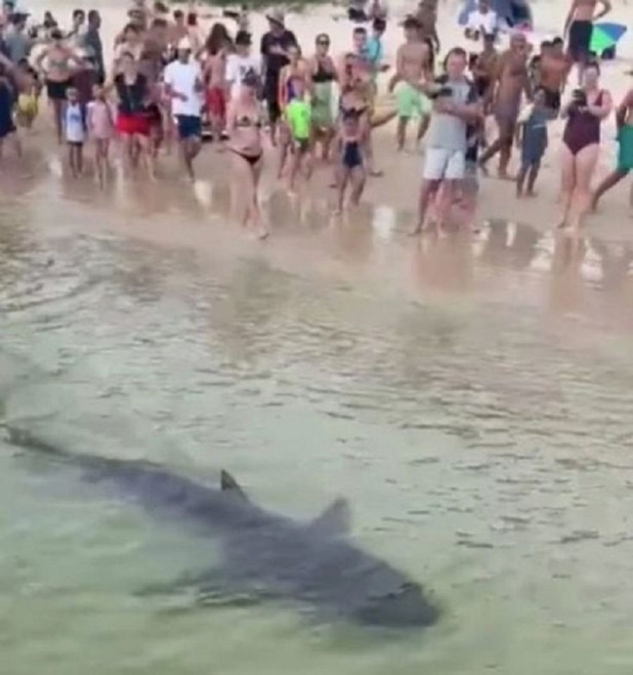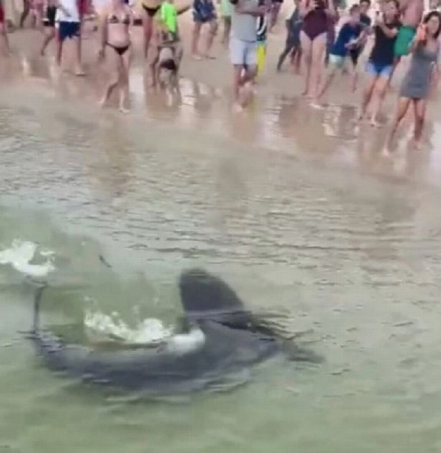 U međuvremenu se može čuti kako druga osoba govori „pazite, mogla bi da zamahne!“ Povređena ajkula se zatim vraća na obalu pre nego što se okrene na bok. To se događa nakon što su masivnu tigrastu ajkulu od 900 kilograma pogodili ribari na malom čamcu pored obale Sidneja nakon 45-minutne borbe.