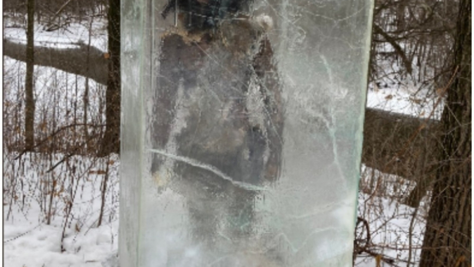 U parku Teodor Virt u Mineapolisu prolaznike je zaprepastio kip pećinskog čoveka u velikom ledenom bloku.