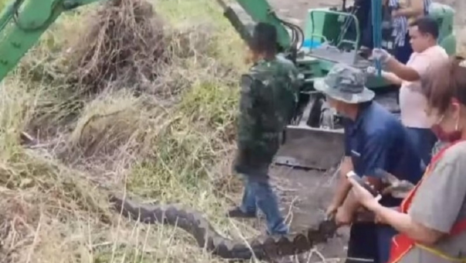 Kako se vidi na snimku, njih šestoro je izvlačilo zmiju, dok su dvojica muškaraca bila na omanjem bageru, koji je pomagao u izvlačenju pitona.