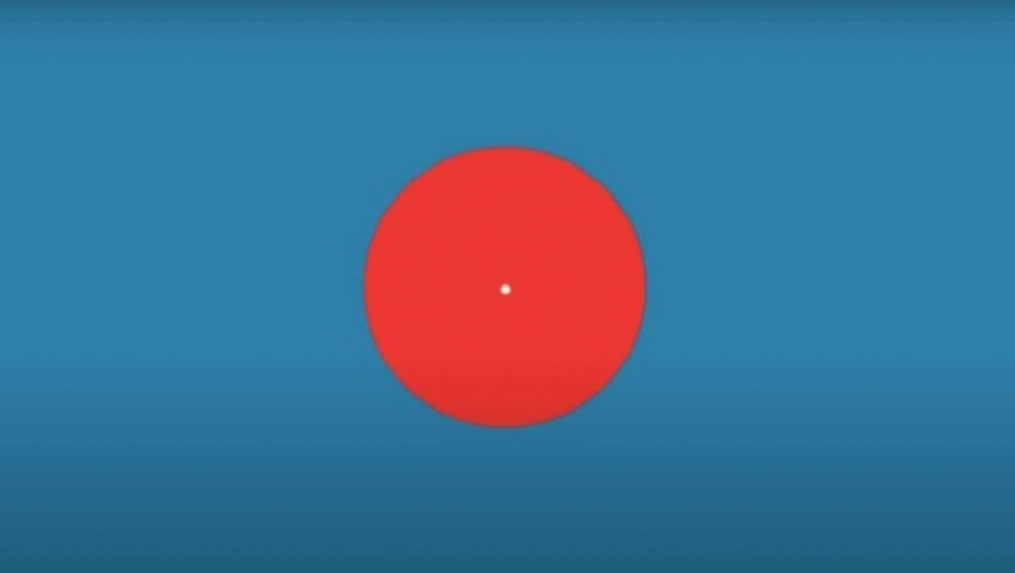 "Pokazaću vam boju koju verovatno nikada ranije niste videli. Zove se" prava tirkizna ", a većina televizora ili monitora ne može da prikaže tu nijansu", kaže Bakon u videu. Zatim prikazuje crveni krug sa belom tačkom u sredini, koji su postavljeni na plavu pozadinu.