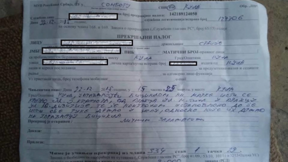 Kako piše u prekršajnom nalogu kontrolom je ustanovljeno da je obe ruke držao u džepu.