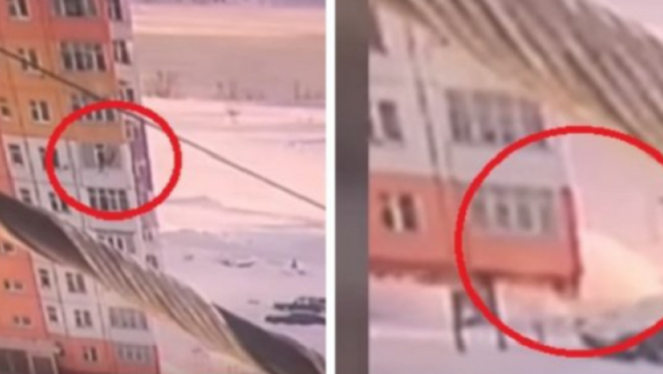 Na snimku objavljenom na lokalnom TV kanalu, jasno se vidi kako žena pada sa visine u sneg, koji se raspršuje u različitim pravcima.