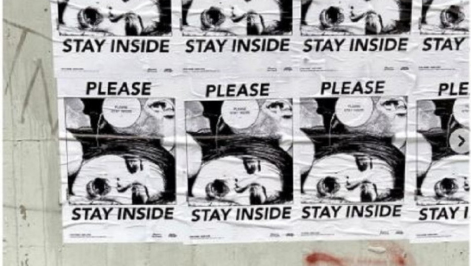 Plakati sa natpisima „ Molim vas, ostanite unutra - spasite živote“ apeluju na ljude da ostanu kod kuće. Takođe prikazuju crno-belu ilustraciju žene tokom seksualnog odnosa, što izaziva dvostruko značenje slogana. Dvosmislenost „Ostani unutra“ može značiti „ ostani kod kuće“ ili „ostani u meni“.