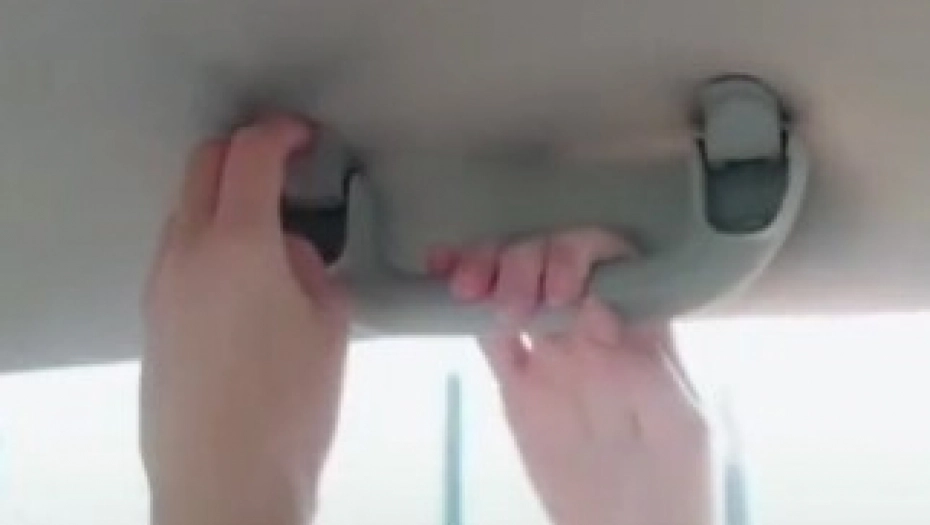 Video počinje tako što ona povlači ručicu iznad suvozačevog prozora pre nego što okrene malu rezu unutra. Ova kuka drži ručku na mestu, što olakšava kačenje stvari.
