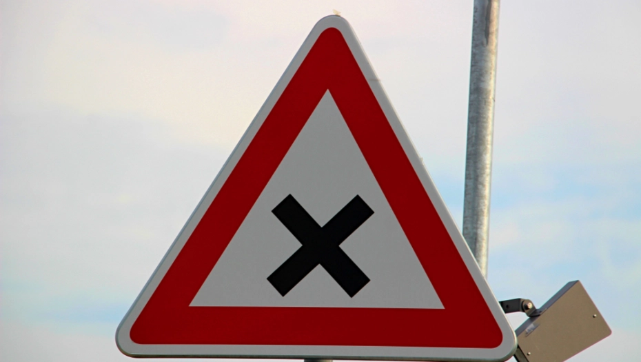 U trouglu oivičenom crvenom bojom je znak "ukrštanje puteva iste važnosti". To je saobraćajni znak upozorenja da nailazite na raskrsnicu na kojoj se ukrštaju putevi od kojih "nijedan put nije put sa prvenstvom prolaza", tako da morate da propustite vozila koja vam dolaze sa desne strane.