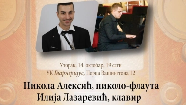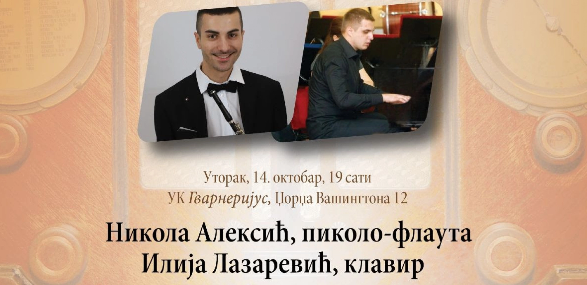 Na koncertu “Muzika za pikolo flautu” nastupiće talentovani mladi umetnici - Nikola Aleksić (pikolo-flauta) i Iliija Lazarević (klavir). Na programu koncerta su dela Šnajdera, Mocarta, Dorfa, Amande Harberg, Ivane Govorčin i Damarea.