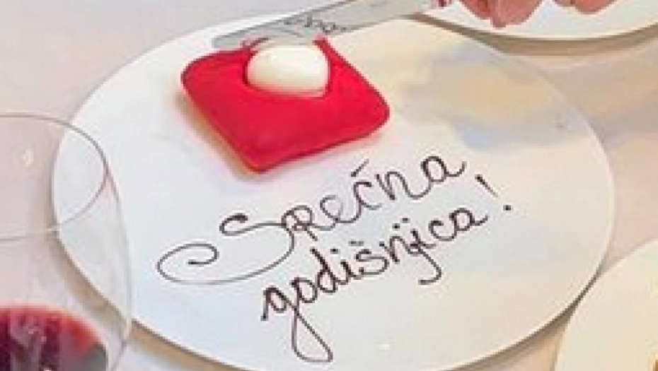 Na slikama se može videti i jedan zanimljiv detalj - poslastica, odnosni mali kolač serviran na velikom tanjiru s jestivom, karamel porukom "Srećna godišnjica".